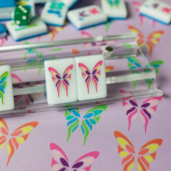Bring twice the brightness to your game with our Electric Blue Garden Double-Sided Mahjong Mat. One side features a pattern of our signature colorful butterfly dragons and the other side a caning graphic created with our TMH initials. This mat creates a stunning backdrop, especially to our Brights! Electric Blue House Tiles, but is designed to mix-and-match with any tiles in the Brights House Collection, adding style and whimsy to every colorful game.
