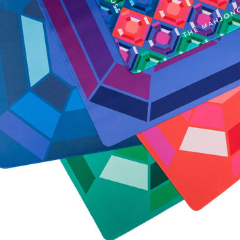 A travel-sized mahjong mat for use with our travel sets. Bring twice the brilliance to your game-on-the-go with our Sapphire Gem Double-Sided Mahjong Mat. One side features one large faceted sapphire and the other side a pattern of all of our Jewel Collection jewels. This mat creates a stunning backdrop, especially to our White with Jewel-Tones Travel Mahjong Set, adding luster to every jewel of a game.