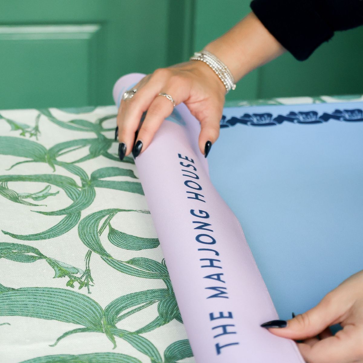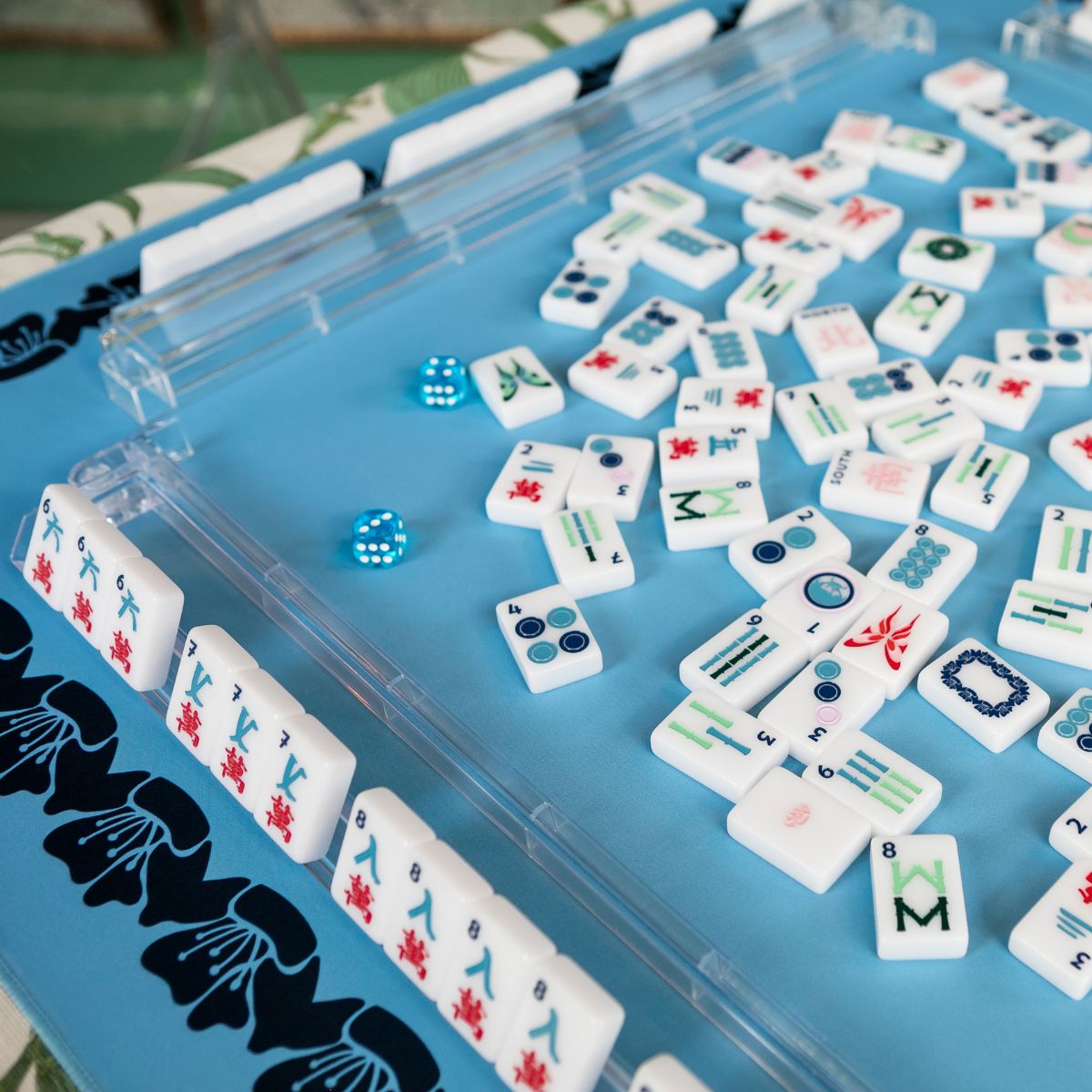 Bring double the elegance to your game with our brand new reversible mahjong mat. That's two beautiful mats in one! One side features a delicate peony design in blues on a light purple field. The other side is our Mahjong House flower border in navy on a light blue field. This mat creates a stunning backdrop, especially to any tiles in our House Collection, adding warmth and charm to every game. Mats at The Mahjong House are designed to make each hand feel as special as the last.